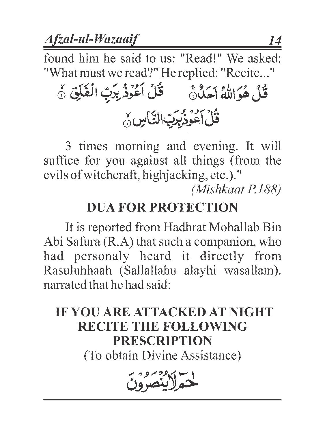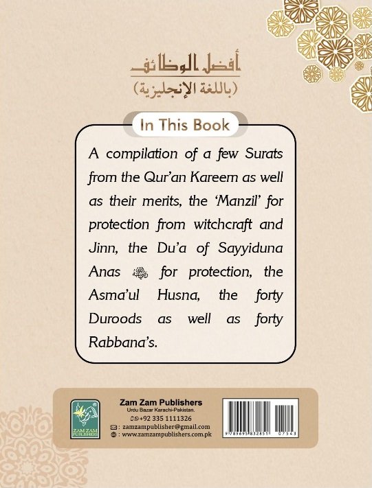 A compilation of a few Surats from the Qur’an Kareem as well as their merits, the ‘Manzil’ for protection from witchcraft and Jinn, the Du’a of Sayyiduna Anas for protection, the Asma’ul Husna, the forty Duroods as well as forty Rabbana’s.