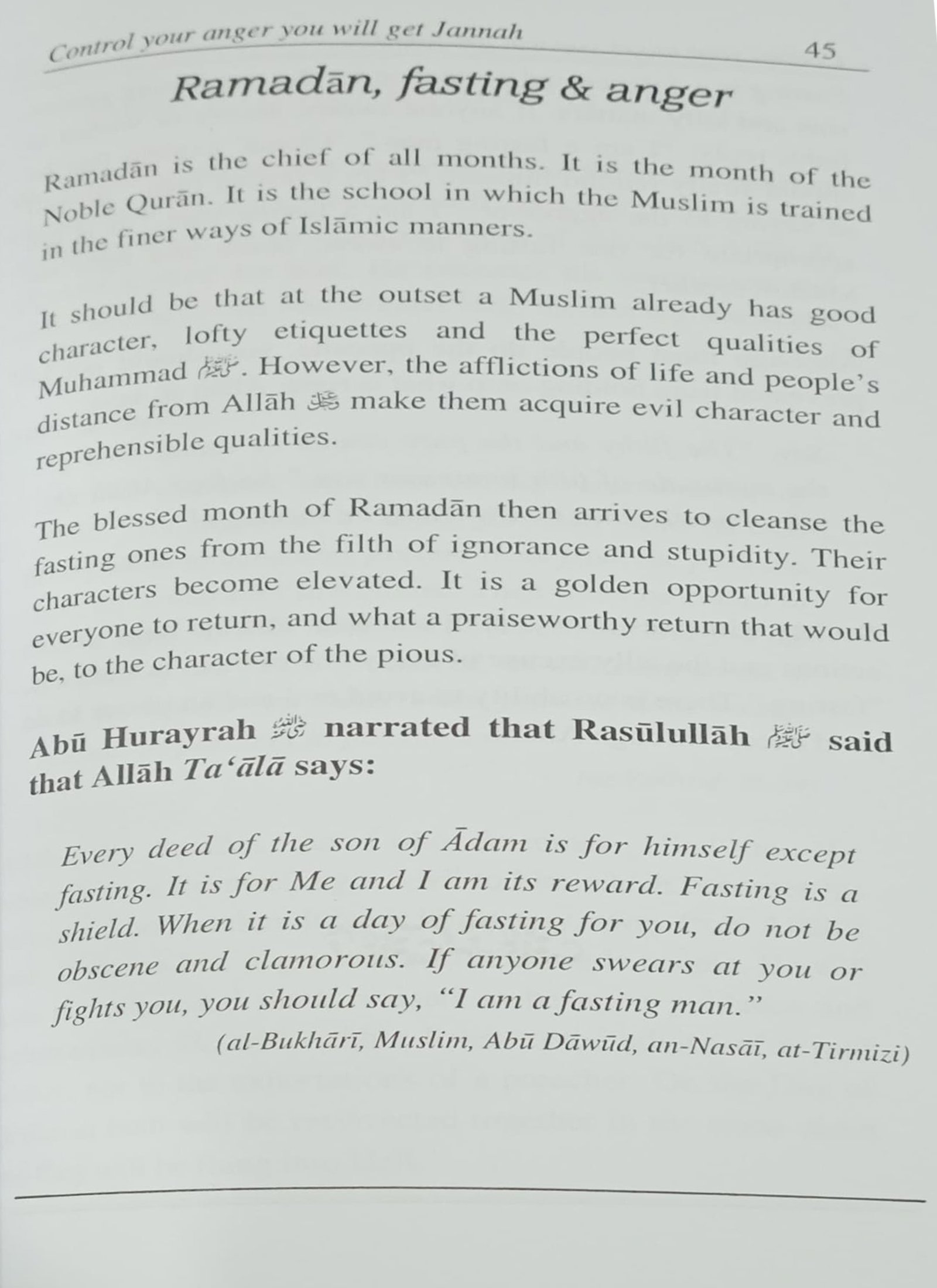 These reasons made me think of composing a book on this topic. I have drawn from different types of sources, the highest of which is the Noble Quran, followed by the Pure Nabawi Sunnah, the books and magazines, and what I have personally witnessed concerning the effects of anger and being quick to get angry.